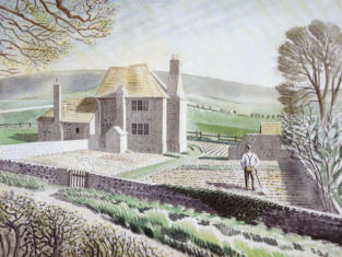 1934 painting by Eric Ravilious, titled "Shepherd's Cottage, Firle". Depicts a house with a man tending its